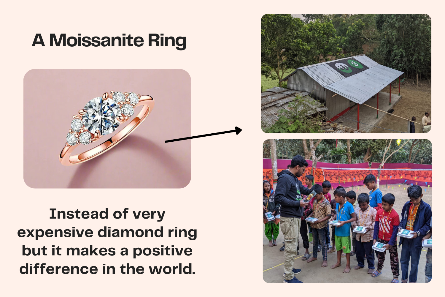 We aim to redefine what it means to enjoy luxury. We believe that true wealth lies in our ability to make a positive difference in the world. That’s why we’ve created a jewelry line that combines the brilliance of Moissanite with a purpose-driven mission.